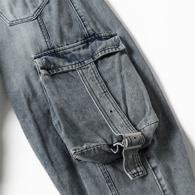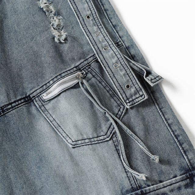 ダメージ加工やジップ付きポケットやベルト付きポケットなど様々な加工やギミックの施された個性派デニムカーゴパンツ。