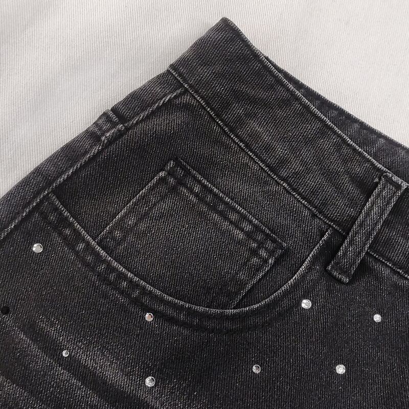 ゆったりとしたワイドシルエットのブラックデニムにレトロな雰囲気のある加工とライトストーンがあしらわれた個性的なデニムパンツ。どんな服とも合わせやすく個性が出しやすいおすすめの1着になっています。