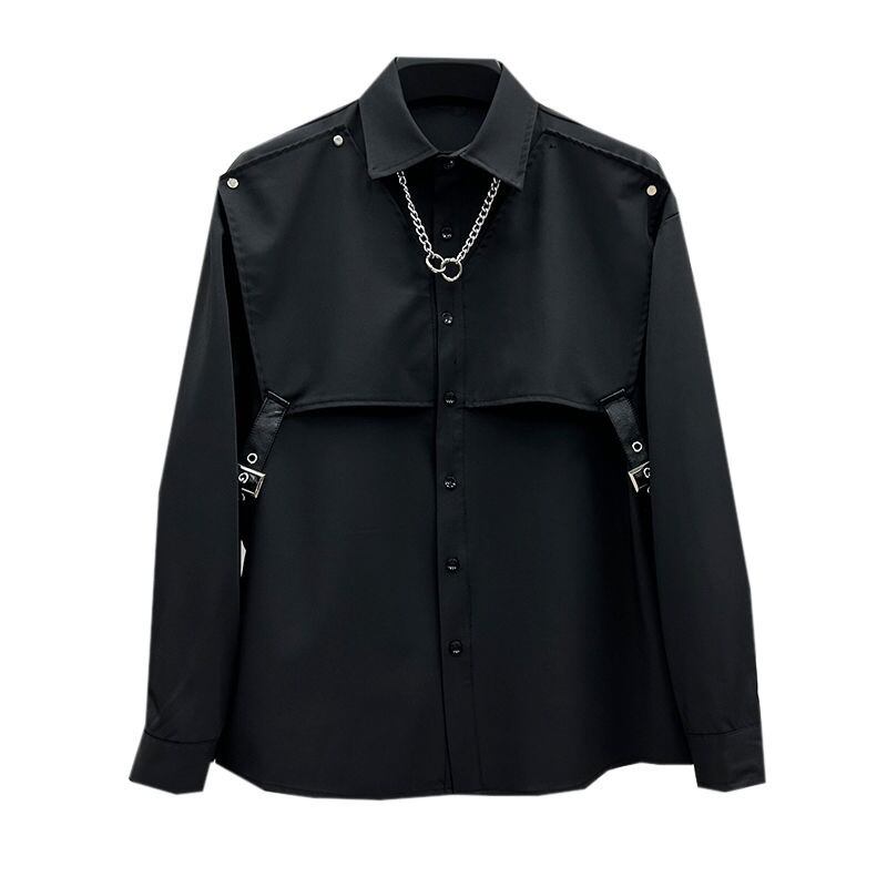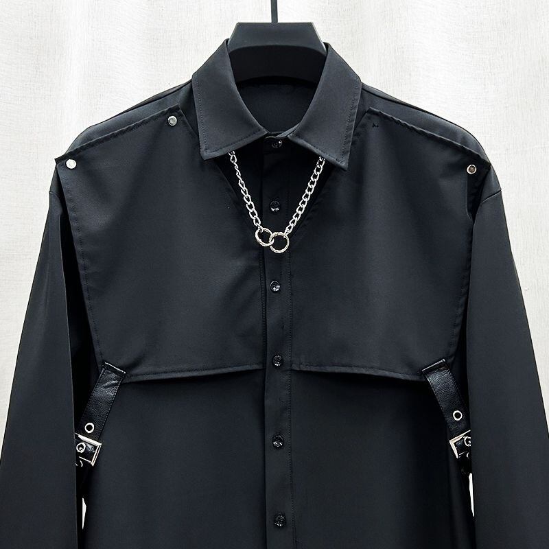 生地が2枚重なっているフラシデザインや、首元のアクセントとなるネックレスなど様々な装飾の着いたただのシャツとは一味違うデザインシャツ。メンズ商品のためサイズが大きいものになりますがレディースの方でもオーバーサイズに着ることが可能です。
