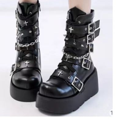ベルトの装飾がついたレザー素材のブーツ。合計4本ものベルトの装飾により存在感があり、地雷系やサブカル系にぴったり!