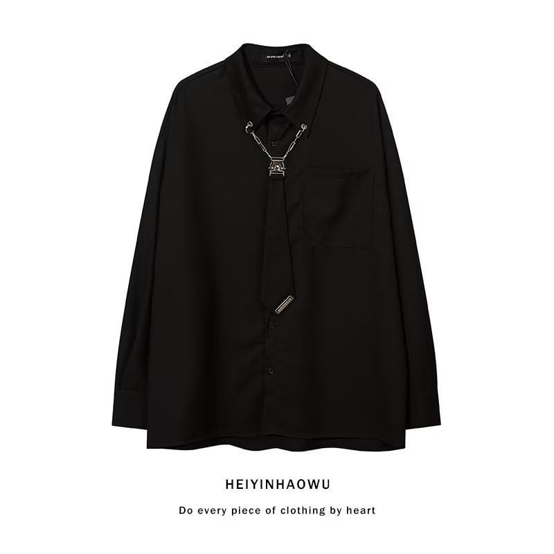アクセントになるシルバーのチェーンでネクタイが取り付けられているネクタイシャツ。サブカル系やモード系とも相性抜群!