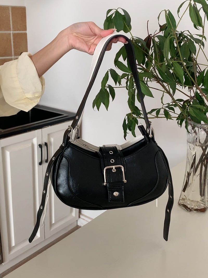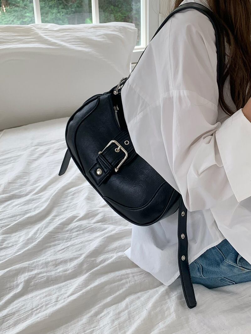 シルバーのベルト装飾が存在感あるレザー素材のショルダーバッグ。