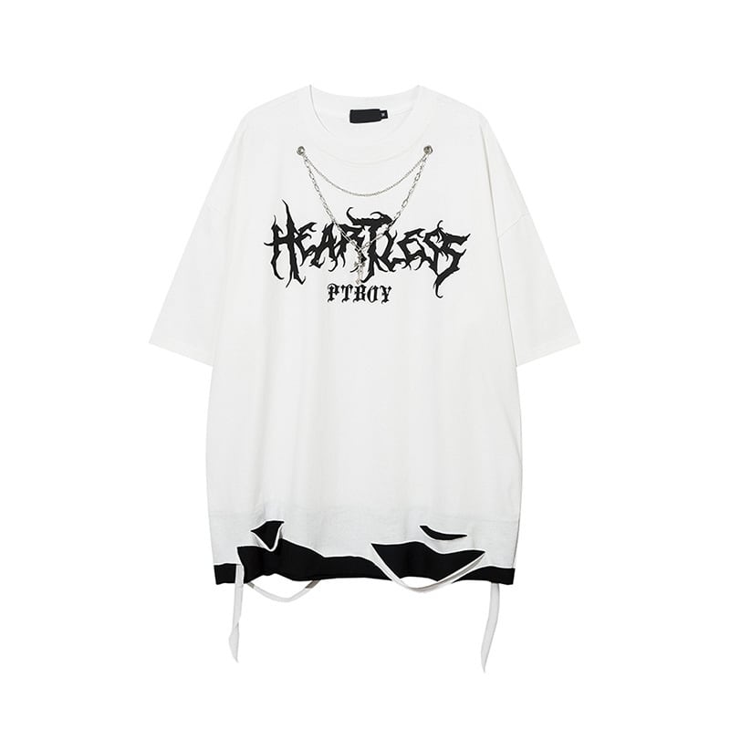 裾にダメージ加工が入ったロングTシャツ。地雷系やサブカル系、グランジやY2kなど様々な系統に合うこと間違いなし!何を着たらいいか迷いがちな夏も大活躍します!