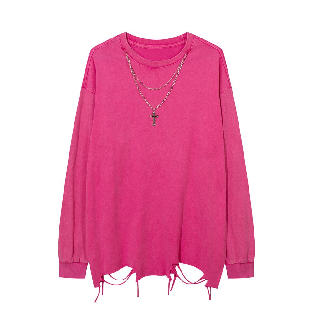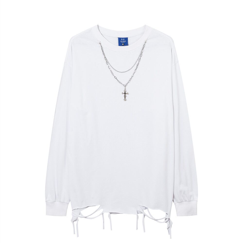 シンプルな無地のロンTにダメージ加工が施されていてグランジ感のあるコーデを簡単に組むことができます。